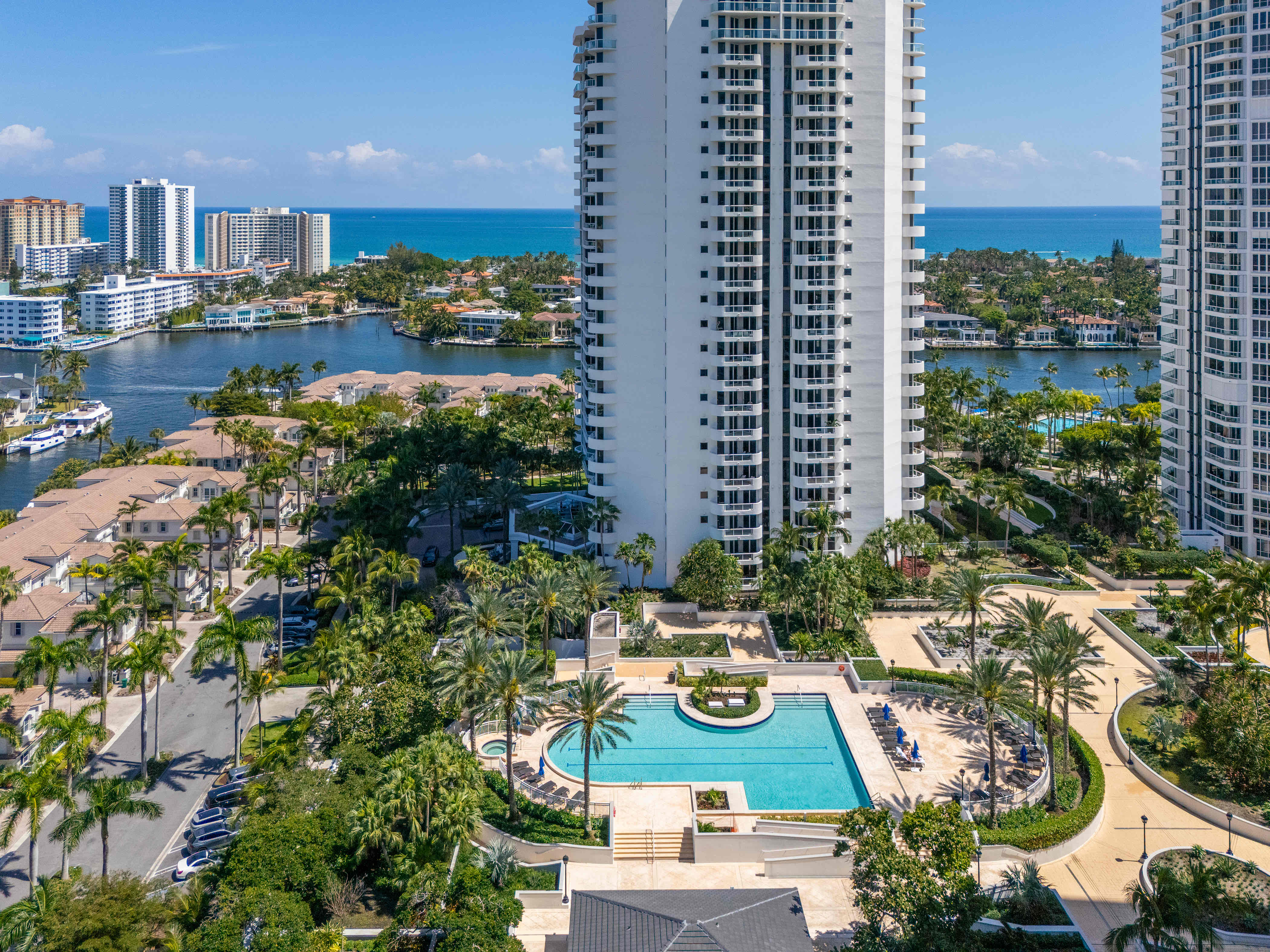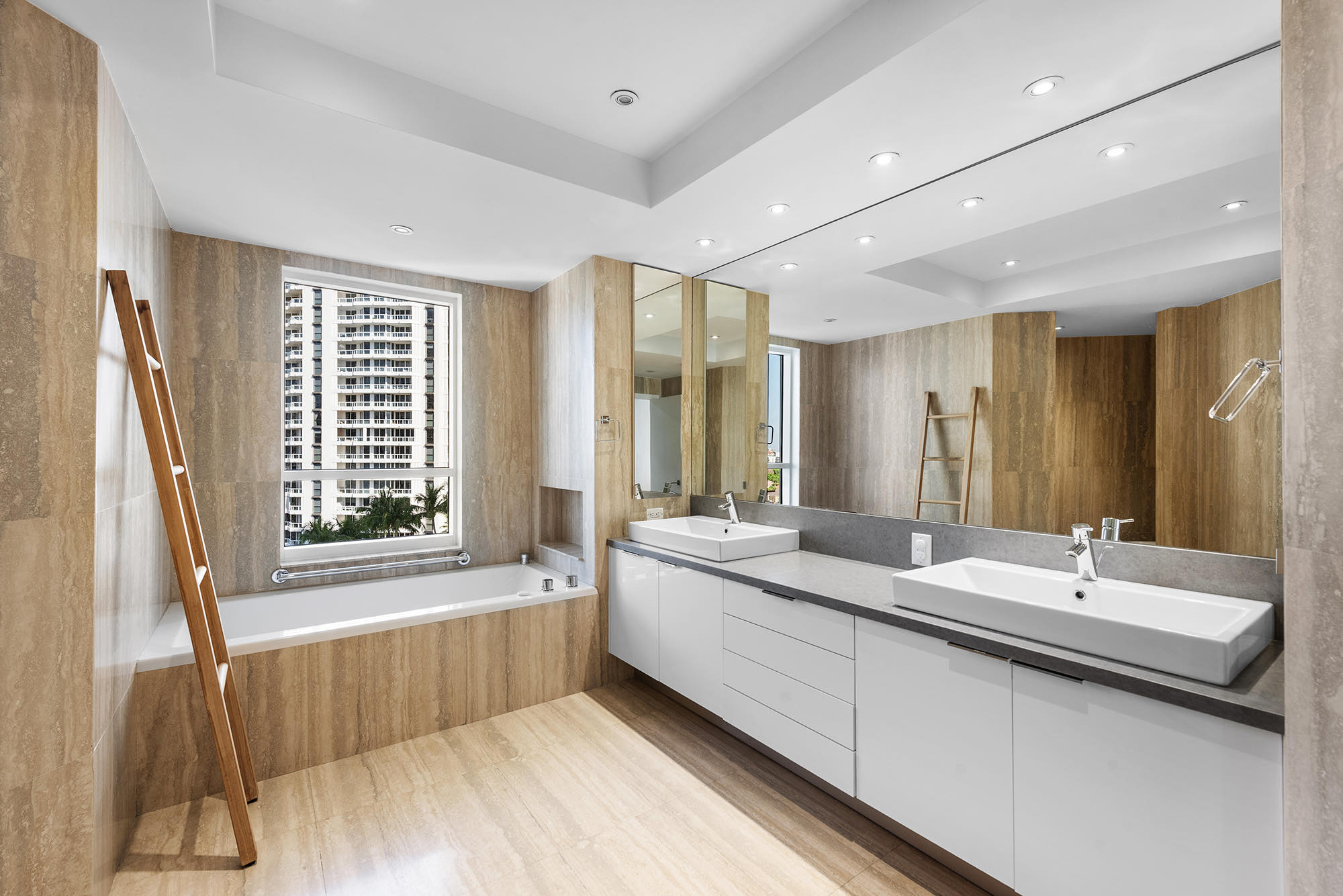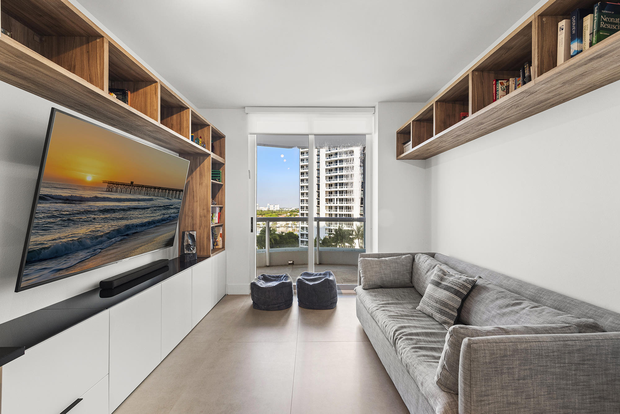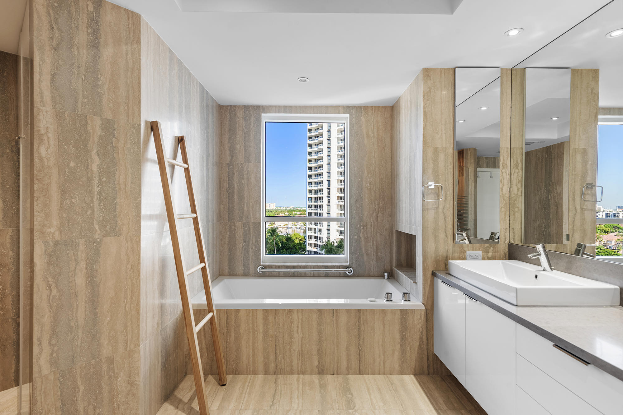 Located in the prestigious Atlantic III, this luxurious apartment offers breathtaking water views and exceptional comfort. It features 3 spacious rooms - one currently used as an office, two full baths, and a half bath. The master suite is a private sanctuary with high-end electronic blinds and walk-in closet, complemented by elegant non-electronic blinds throughout. Polished porcelain floors run seamlessly across the living spaces. The master bathroom, crafted from premium travertine, and the mosaic-tiled second bath add sophisticated touches. Residents enjoy world-class amenities such as a billiard room, private aerobics, a movie theater, valet service, 24-hour concierge, security, a library, and a fully equipped gym—perfect for a refined, convenient lifestyle.